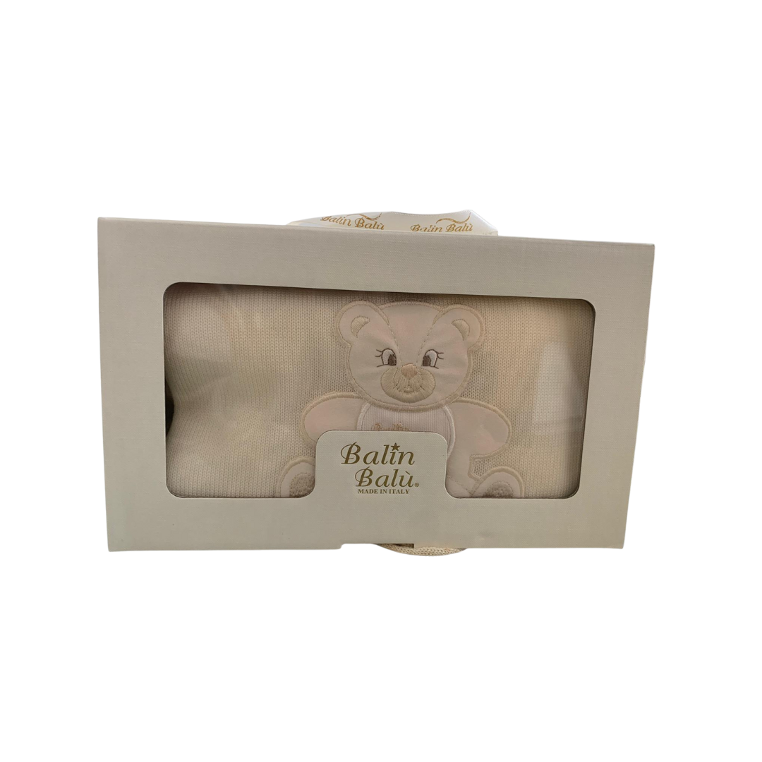 Maglia liscia con riquadro in risalto e orso ricamato al centro nel telo superiore della coperta. Il telo di sotto è creato in maglia liscia con la funzione di fodera. Il tutto rifinito al perimetro con bordo in maglia liscia e di stessa lana merinos.