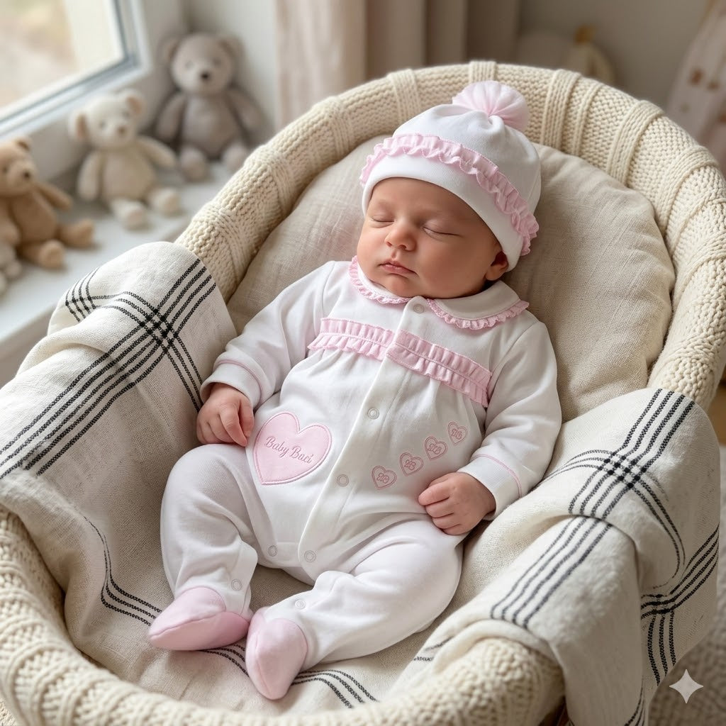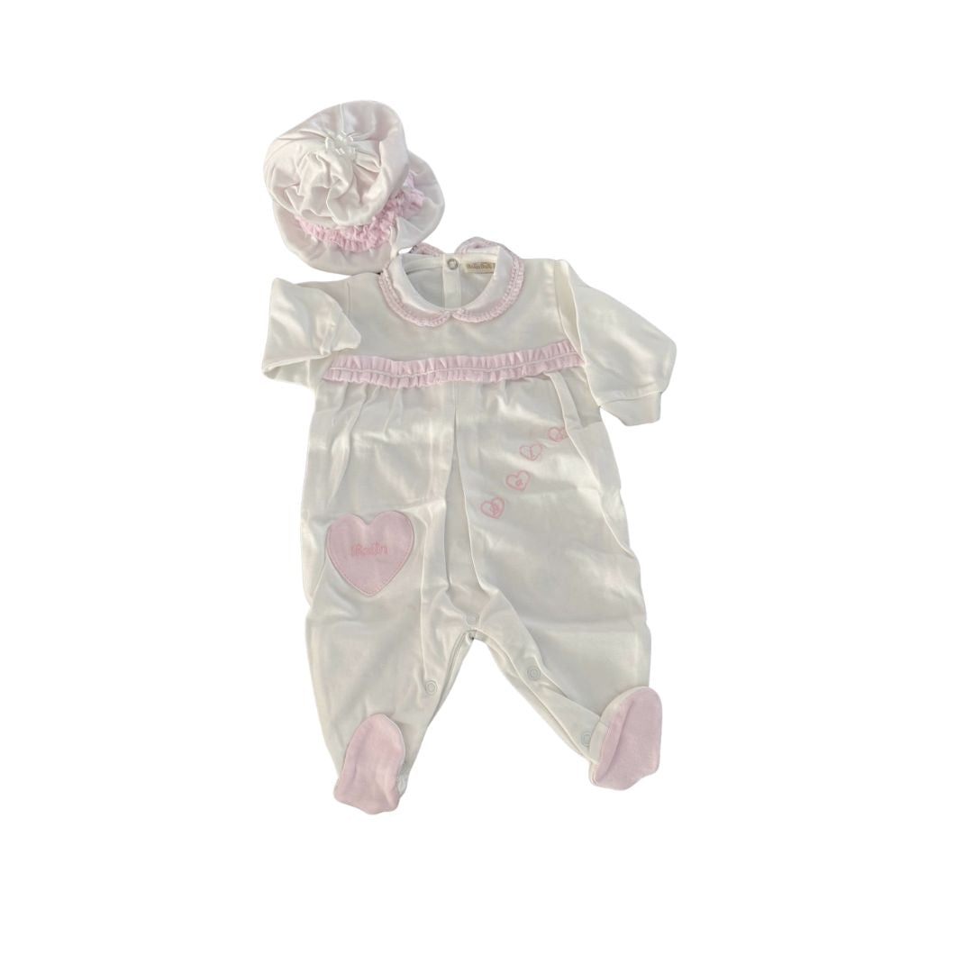 Design Romantico: Arricchita da dolci ricami a forma di cuore e l'esclusiva firma "Baby Baci", questa tutina celebra l'amore in ogni punto.